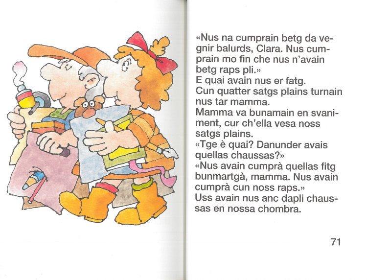 | Indicaziuns bibliograficas Autur(a): Dimiter Inkiow (cun illustraziuns da Fritz Goller) Titel: Mia sora Clara e las mieurs alvas Chasa editura: Uniun Rumantsch Grischun Onn da publicaziun: 1994 Dumber da segns: ca. 25 000 (84 p.) Links Preschentaziun dal cudesch Cumprar Emprestar Unitads didacticas |