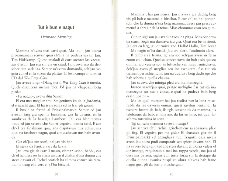 | Indicaziuns bibliograficas Autur(a): Div. autur(a)s Titel: Curaschi per dudesch. 12 istorgias per curaschi civil Chasa editura: Lia Rumantscha (Ueberreuter) Onn da publicaziun: 2002 Dumber da segns: ca. 192 000 (144 p.) Links Preschentaziun Cumprar Emprestar Unitads didacticas |