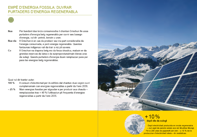 «Il chantun Grischun prenda primarmain per mauns il consum d’energia – ed indirectamain natiralmain er l’igiena da l’aria. I vegn prendì en mira ina societad da 2000 watts – quai vul dir: mintga burgaisa e mintga burgais dal Chantun reducescha fin l’onn 2050 si’emissiun da gas cun effect da serra a maximalmain 1,5 tonnas per onn.»