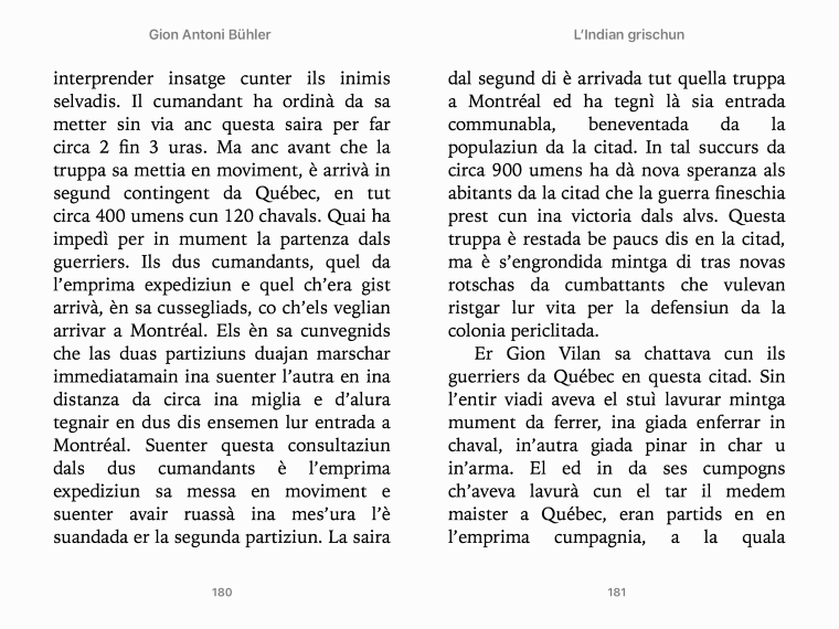 | Indicaziuns bibliograficas Autur(a): Gion Antoni Bühler Titel: L’Indian grischun Onn da publicaziun: 2017 (e-book en rumantsch grischun; la versiun originala en ‹romontsch fusionau› è cumparida il 1890) Dumber da segns: 192 600 Links Telechargiar sco e-book Il text sin Vichisource |