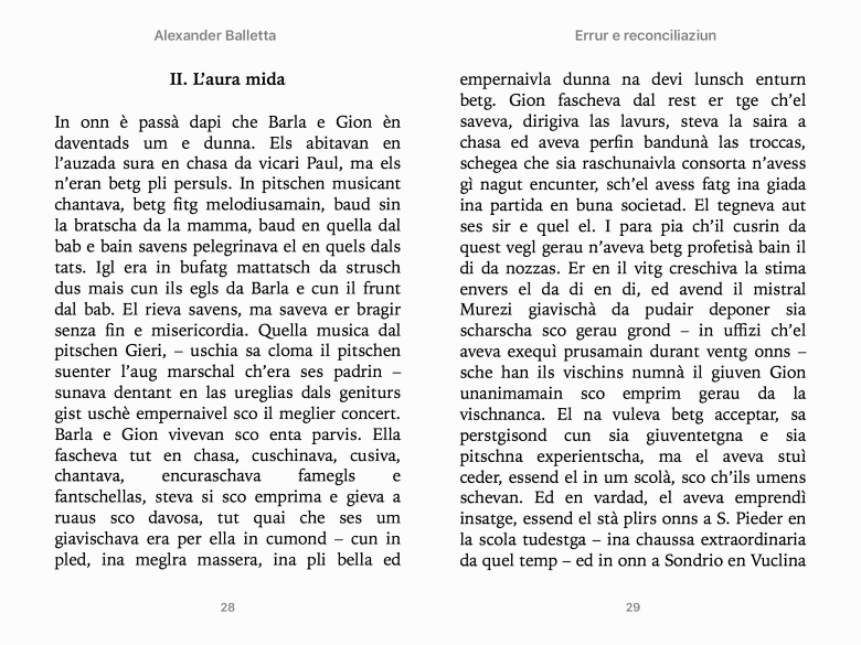 | Indicaziuns bibliograficas Autur(a): Alexander Balletta Titel: Errur e reconciliaziun Onn da publicaziun: 2018 (e-book en rumantsch grischun; la versiun originala en sursilvan è cumparida il 1886) Dumber da segns: 95 100 Links Telechargiar sco e-book Il text sin Vichisource |