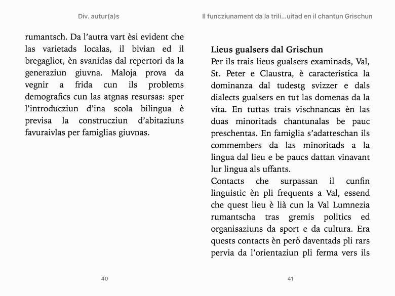 | Indicaziuns bibliograficas Autur(a): Div. autur(a)s Titel: Il funcziunament da la trilinguitad en il chantun Grischun Onn da publicaziun: 2008 (versiun stampada) / 2018 (resumaziuns rumantschas sco e-book) Dumber da segns: 44 100 Links Telechargiar sco e-book Preschentaziun dal cudesch Dossier tematic davart la trilinguitad chantunala |
